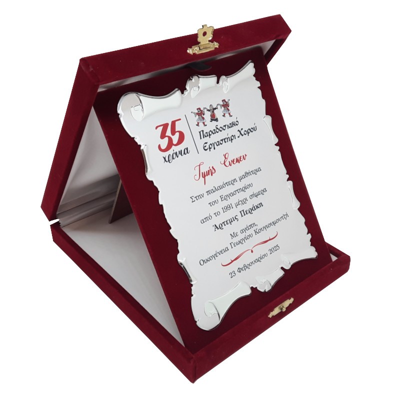 Engraved plaque in a blue velvet case in a rectangular, landscape shape. Choose between silver or gold-colored plaque.