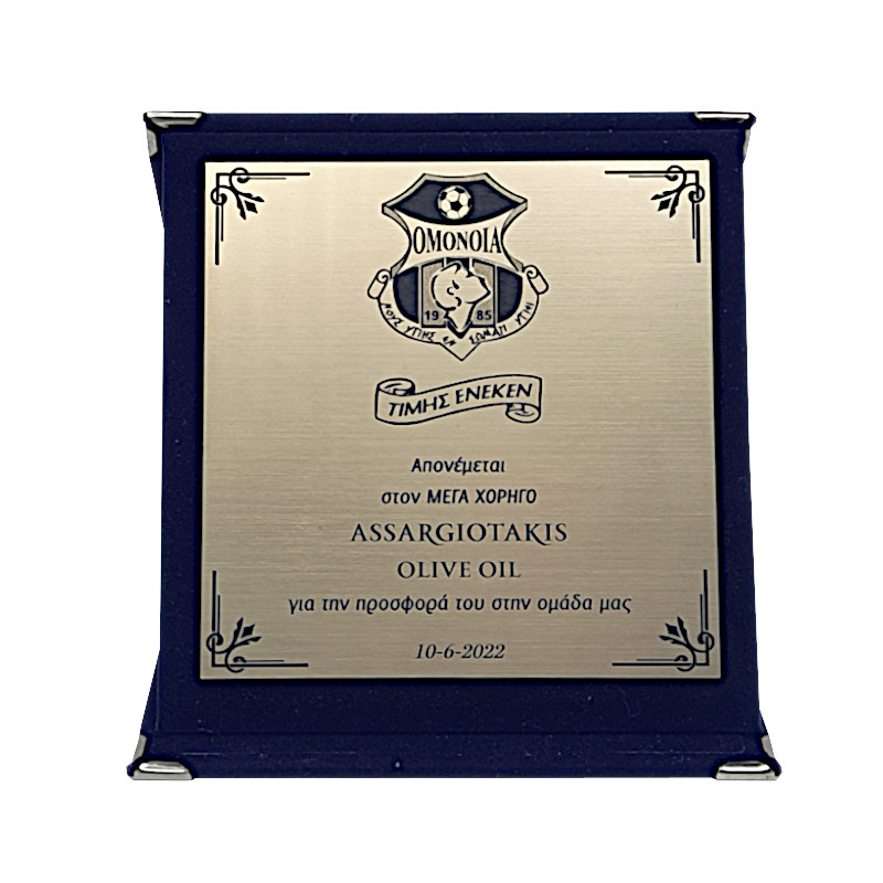 Engraved plaque in a blue velvet case in a square shape. Choose between silver or gold-colored plaque.