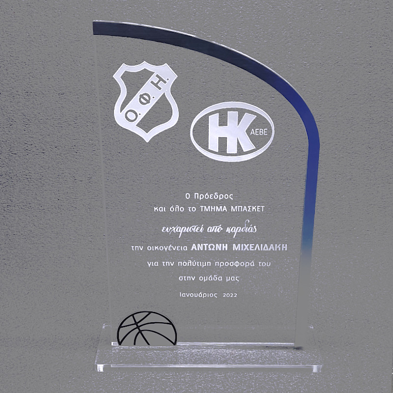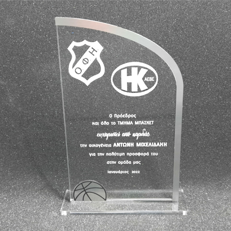 Ακρυλικό τιμητικό έπαθλο με χαραγμένο κείμενο και λογότυπο. Προσφέρει κομψή εμφάνιση και ανθεκτικότητα.
