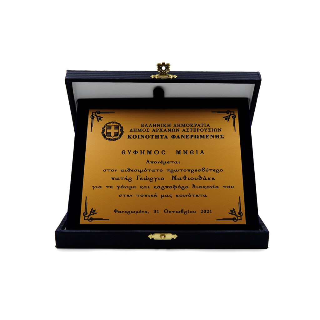 Κασετίνα Βελούδινη με χρυσή ή ασημένια εγχάρακτη πλακέτα. Κομψή επιλογή για απονομή ή τιμητική διάκριση.