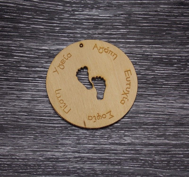 Κονκάρδα γέννας με πατουσάκια και χαραγμένες ευχές. Κατάλληλο για ενθύμιο γέννας, με τρύπα για μπρελόκ ή χωρίς για μαγνητάκι.