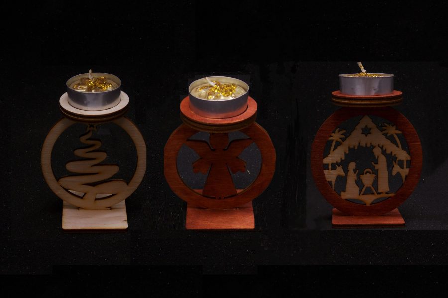 Σετ διακοσμητικά ξύλινα χριστουγεννιάτικα κηροπήγια με διαφορετικές παραστάσεις και χρωματισμούς.